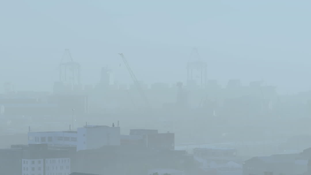 Animation depicts a city skyline with digital shapes overlaying the urban landscape, creating a futuristic and technological ambiance. The hazy, foggy background sets an atmospheric tone. Ideal for using in presentations related to technology trends, urban development, global business news, and innovative architecture.