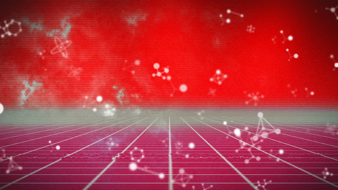 This abstract visual combines elements representing digital technology and cloud computing, set against a vibrant red background and web of interconnected lines and molecular structures. Ideal for illustrating concepts in technology innovation, digital transformation, or futuristic interface designs. Enhancement of presentations, websites, or articles related to high-tech industries can benefit. Suitable for themes addressing network connectivity and modern computing systems.