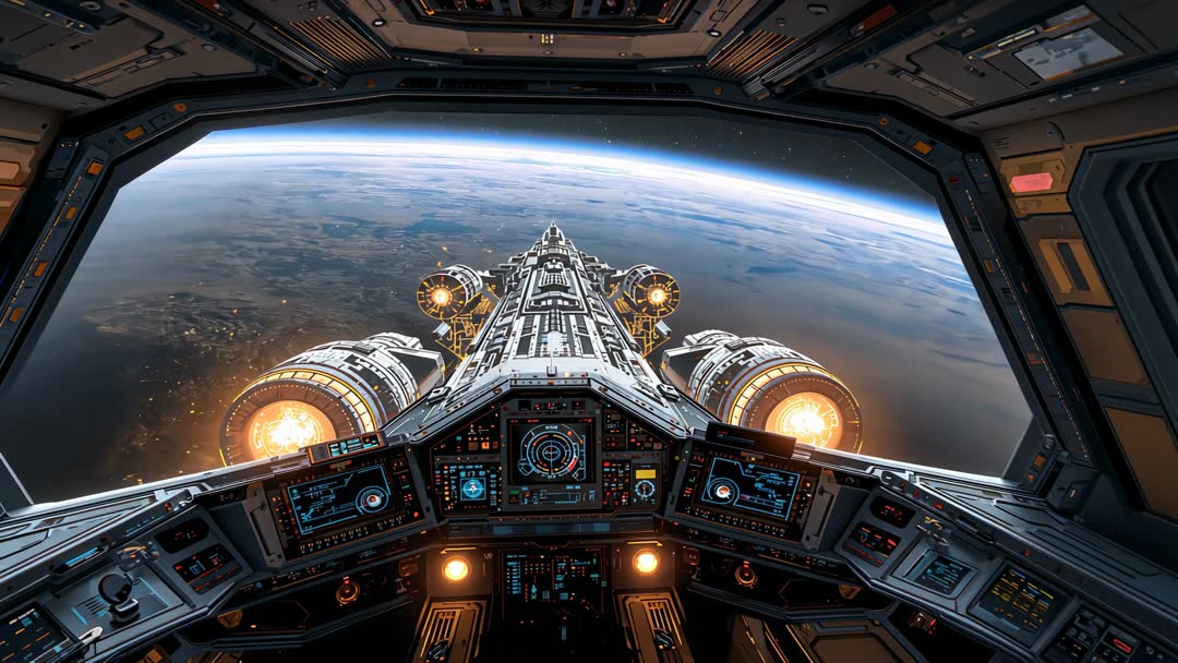 AI Generated Image. Panoramic cockpit view guiding starship toward massive orbital carrier above curved planet horizon. Instrument panels displaying navigation data, radar overlays, engine throttle readouts, and mission HUD elements. Engine bells glowing with warm thrust light, exterior docking bay and rendezvous target dominating forward view. Camera panning from console to forward window, showcasing dynamic control screens and structural details of starship spine. Suiting sci-fi film trailers, space exploration documentaries, technology presentations, and website hero banners. Pairing with electronic soundtrack for cinematic countdown sequences or with educational narration for orbital operations and spacecraft systems explainers. Providing layered footage for UI mockups, title cards, commercial advertising, game trailers, and VR experience backgrounds.