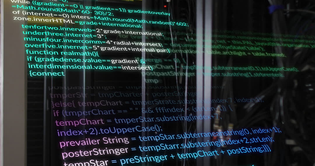Digital display showcases intricate coding data and programming interface overlayed on server racks. Ideal for illustrating themes of cybersecurity, information technology, digital economics, and futuristic network operations. Useful in tech blog articles, business reports, and multimedia presentations.