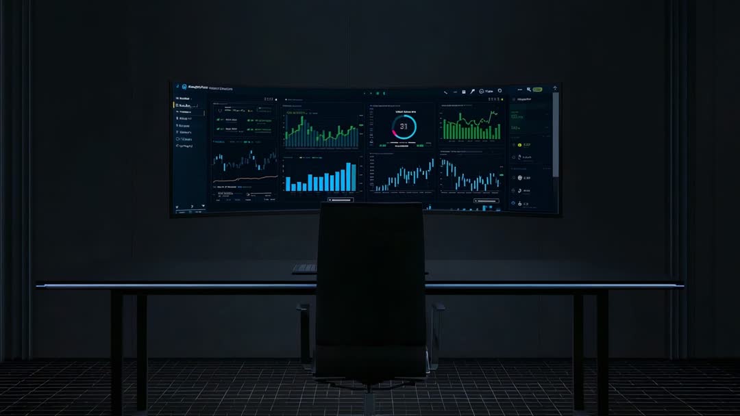 AI Generated Image. Cutting-edge command center with curved monitor showing real-time data visualizations, charts, and analytics in dimly lit environment. Perfect for depicting modern technology, finance, investments, or advanced data monitoring. Ideal for use in articles or presentations related to future strategies, AI integration in data analysis, or technological advancements in finance.