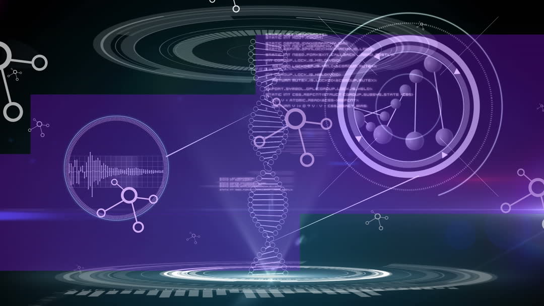 Visually representing the convergence of digital technology and biological science with styled DNA helix and molecular graphics in purple hues. Great asset for biotechnology articles, technology promo videos, science fiction themes, and educational content about genetic engineering.