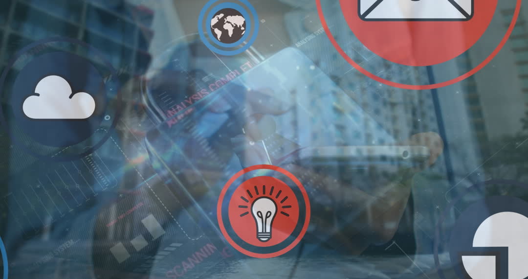 Visual shows futuristic connection icons like cloud, globe, email, bulb overlaying a smartphone user symbolizing digital communication and innovation. Useful for illustrating concepts of technology networks, data exchange, global connectivity, or future tech trends in digital or tech content.