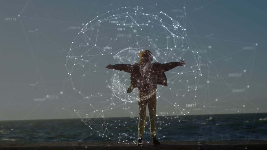 Dynamic representation of modern technology as glowing nodes encircle a woman standing on a waterfront path. Captivating video for promoting tech concepts such as connectivity, future innovations, abstract networks. Useful in technology marketing materials, digital transformation narratives, visualizations of communication networks.