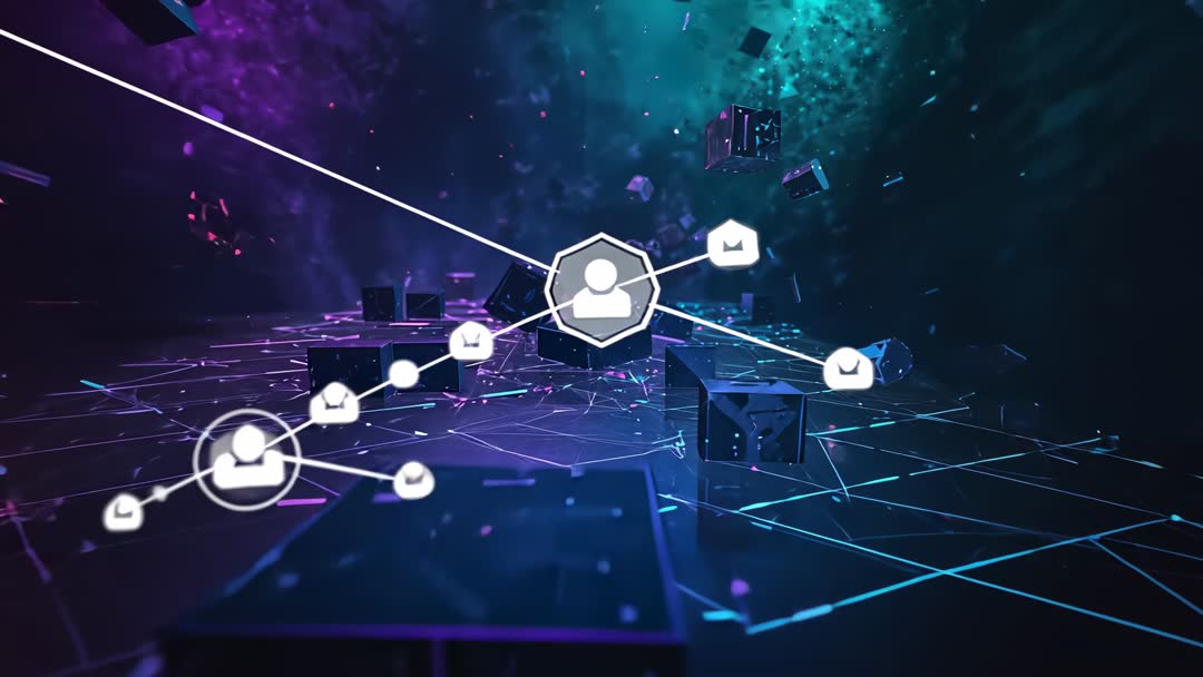 AI Generated Image. This dynamic video abstraction illustrates futuristic digital networks with glowing neon grids. User icons and mail symbols emphasize themes of connectivity and digital communication. Useful for technology-related projects, presentations on AI advancements or illustrating cyber connectivity systems.