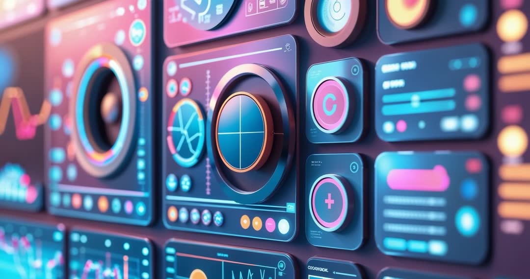 AI Generated Image. This video showcases a high-tech control room interface with a focus on data visualization and monitoring. Dominated by circular dials and digital panels, the design displays various data points and controls in a vibrant and sleek futuristic style. Ideal for uses in tech innovation presentations, futuristic tech environments, or visual media depicting advanced digital interfaces. Its intricate design can attract those interested in software interfaces, technology education, and dynamic graphic presentations.