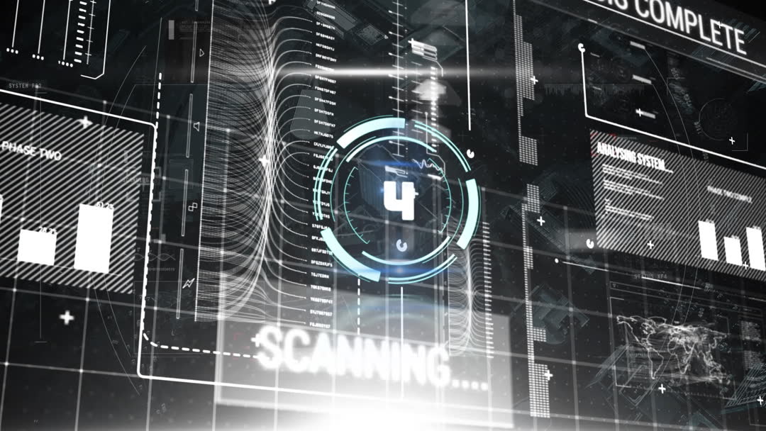 Futuristic countdown foregrounds neon scanner within complex digital interface. Perfect for conveying themes of advanced technology, digital innovation. Ideal for sci-fi projects, tech presentations, modern business videos focusing on cutting-edge technology. Versatile for illustrating computing power, data analytics impacts.