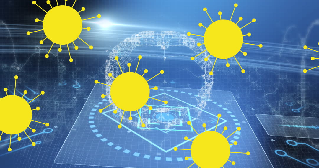 This digital artwork showcases a futuristic representation of COVID-19 cells alongside virtual elements such as a human brain interface. The videory emphasizes technology's role in scientific research and data processing. Useful for illustrating advancements in healthcare, medical data analysis, or the integration of digital technologies in pandemic responses.