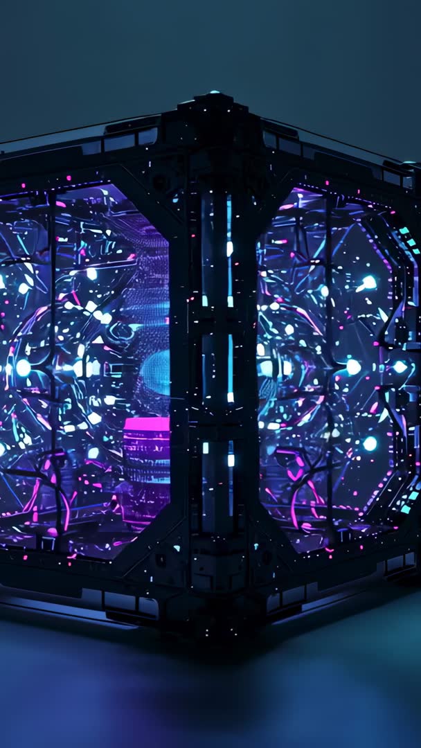 AI Generated Image. Vertical 9:16 clip showing cube powering up inside hexagonal enclosure, holographic panels streaming neon particles and light. Central cyan orb core pulsing with energy, emitting cyan and magenta highlights and creating reflective surfaces and floating data fragments. Visual language emphasizing futuristic tech and cinematic sci-fi mood with deep blues and vivid magentas. Clip formatted for mobile vertical playback, optimized for social platforms and loop-friendly edits. Use cases: serving as intro for tech startup promo, providing backdrop for product reveal reel, enhancing sci-fi trailer or motion graphics showreel, fueling TikTok, Instagram Reels, YouTube Shorts content, supplying eye-catching visuals for event visuals and VJ loops. Post-production tips: applying subtle color grading and lens flares, adding low-frequency synth or percussive sting, placing bold text overlays in negative space along cube edges for titles and CTAs. Licensing ideas: using in commercial ads, broadcast bumpers, app intros, AR/VR demos, and multimedia installations. File features: high-resolution vertical frame, dynamic light sources, clean alpha-friendly edges for compositing and easy integration into edit timelines.