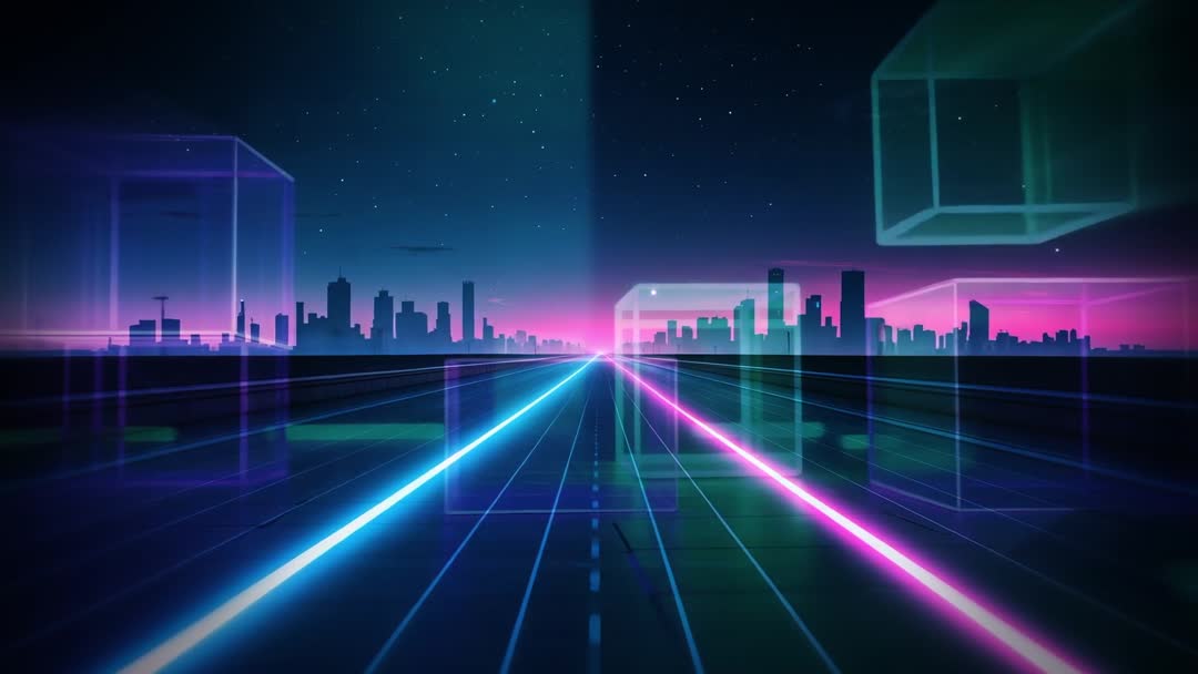 - Futuristic Cyber City with Neon Grid and Wireframe Cubes