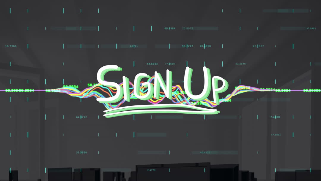 Display highlights a 'Sign Up' message against a high-tech digital background featuring mathematical equations. Ideal for promoting Cyber Monday sale events, technological services, or modern promotional campaigns.