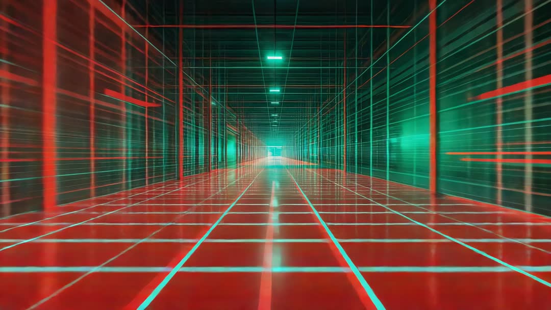 AI Generated Image. Animated scene glides through an infinite digital corridor featuring wireframe walls and a cyan grid floor enhanced by neon red lines and overhanging lights, creating a sci-fi aesthetic. Ideal as background in tech presentations, film scenes portraying virtual realities or intros focusing on computational transformations and modern futuristic themes.