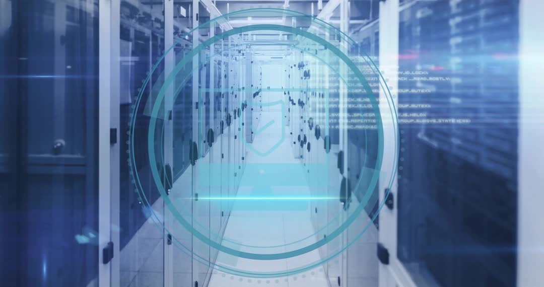 Visual of a high-tech data center corridor with a digital shield icon and network interface graphics. Moving elements suggest cutting-edge cybersecurity measures, focusing on data protection and information integrity. Useful for presentations on network safety, articles on digital transformations, or education regarding cybersecurity systems implementation.