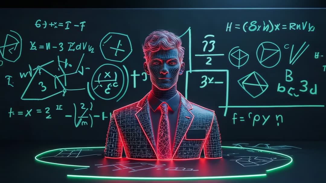 AI Generated Image. This captivating digital artwork displays a holographic male bust with a glowing grid suit. It stands on a neon platform, with a complex mathematical interface in the background. A visual representation of innovative technology and futuristic concepts, it is perfect for use in articles or presentations on advanced digital technologies, AI advancements, educational content about mathematics and physics, and science fiction themed projects.