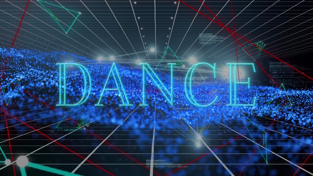 Futuristic visualization depicting the word 'DANCE' in a digital space highlighted by blue glitter effects, connecting triangles, and network lines. This videory evokes a sense of advanced technology and virtual environment, harmonizing movement with digital art. Useful for backgrounds in digital dance events, parties, technology-themed layouts, or music visuals, capturing the essence of modern digital culture.