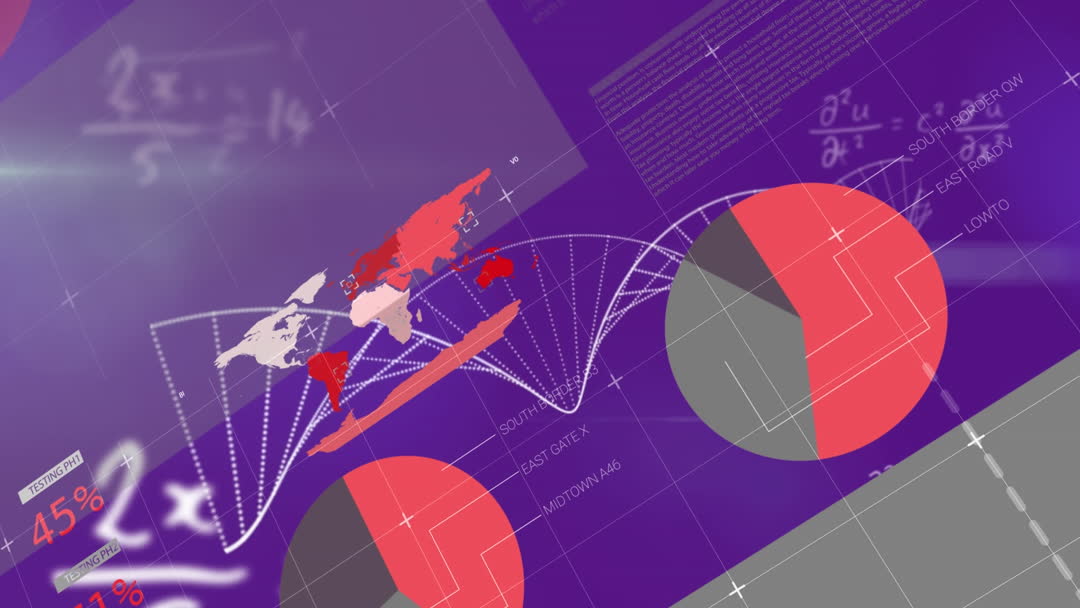 This video creatively represents the intersection of global technology and data processing concepts. The combination of mathematical formulas with a DNA strand emphasizes themes of scientific progression and computational analysis. Ideal for use in presentations, educational materials, and articles focused on digital innovation, data science, or biotechnology advancements.