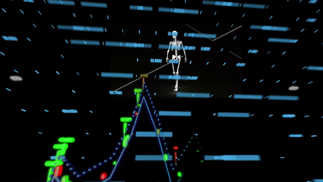 Animation depicting futuristic data processing in science. Includes human skeleton against backdrop of moving charts and data, suggesting technology and digital advancement. Useful for illustrating digital interfaces, research presentations, or concepts in scientific innovation.
