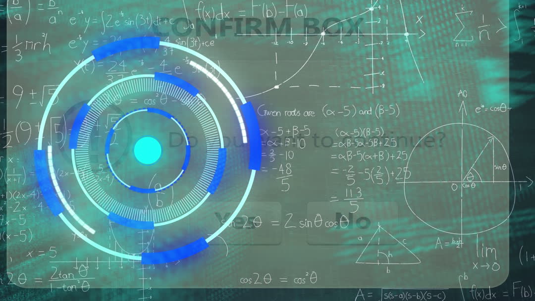 Overlay displaying mathematical equations and graphics, ideal for concepts involving future technology, innovation, and data science. Suitable for educational content or technology presentations.