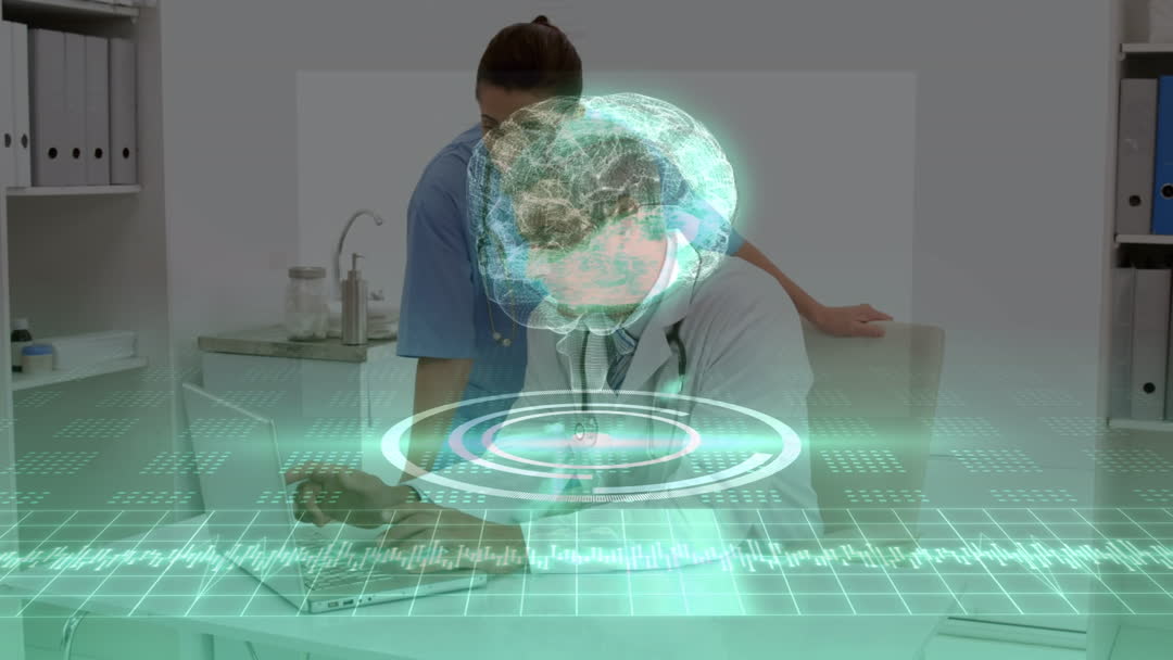 Features an innovative portrayal of medical technology with a focus on data analysis and brain monitoring. This video is useful for presentations on futuristic healthcare solutions, advancements in digital interfaces, and the role of AI in medicine.