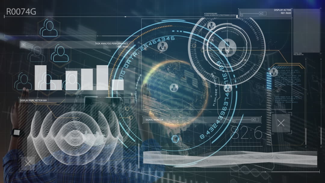 A visual representation of a futuristic interface highlights important elements of modern data analysis including an animated scope. Ideal for illustrating concepts in digital technology, global connections, and data processing innovation, this can be used in contexts related to business analytics or technological advancements.