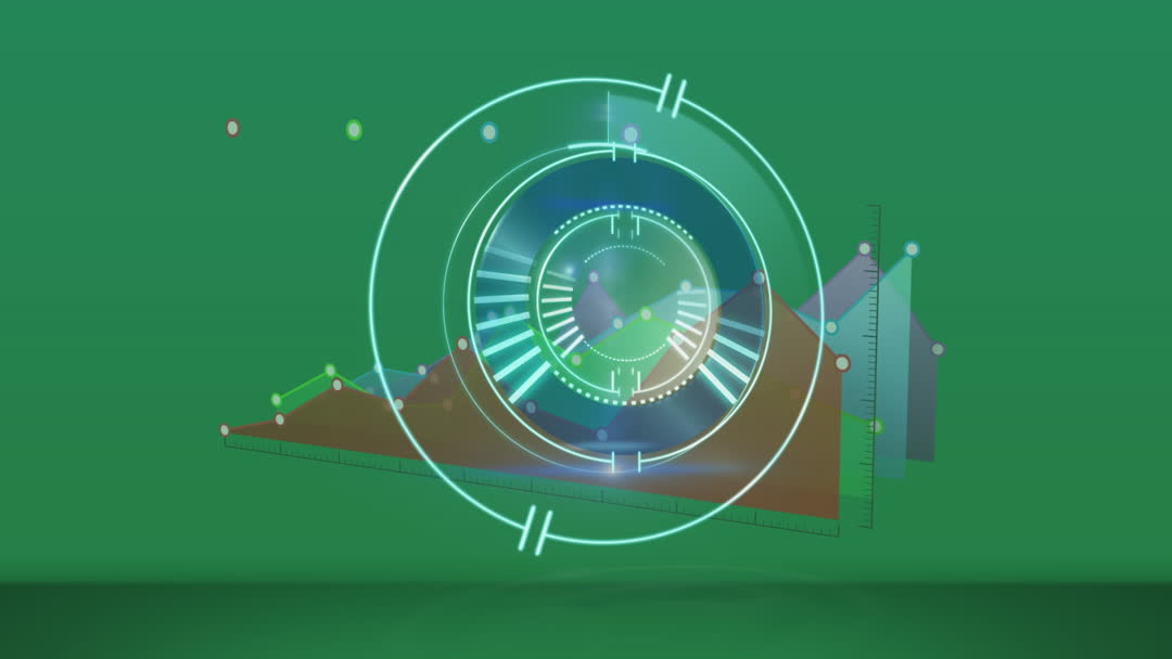 Digital visual showcases advanced data analysis with a futuristic clock-style interface overlaying a graph. Bright colors against green background convey high-tech context, ideal for presentations on technology, financial market analysis, or innovation-driven projects. Use in reports, tech videos or educational materials emphasizing modern data processing techniques.