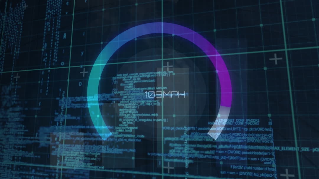Visual depicting fast-paced data analysis with a dynamic digital interface overlay. Ideal for technology-focused presentations, illustrating concepts in data science, digital security, or futuristic software development applications.