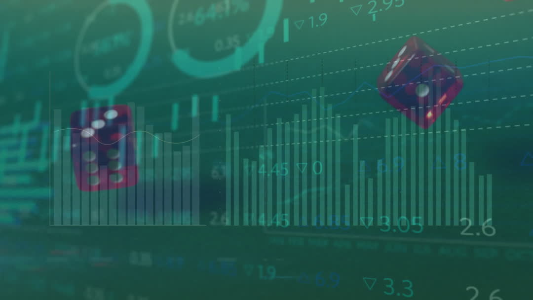 Visual representing digital data processing intersecting with gambling industry concepts. Instinctively connects stock market fluctuations with dice rolls, indicating risk symbolism in investments. Suitable for articles or presentations on finance, gambling technologies, or data-driven decision-making environments.