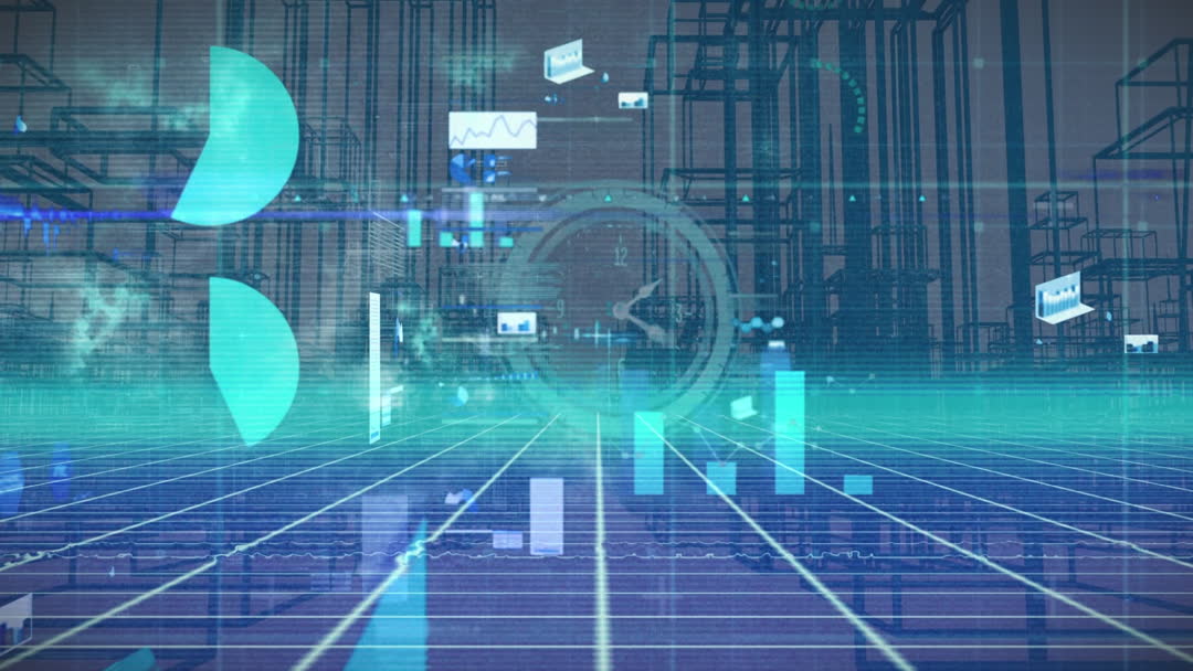 Animation showing complex data processing with elements like digital graphs and clock enhances themes of advanced analytics, technology, and global business operations. Suitable for technology conferences, business presentations, and video productions focused on futuristic or innovative concepts.