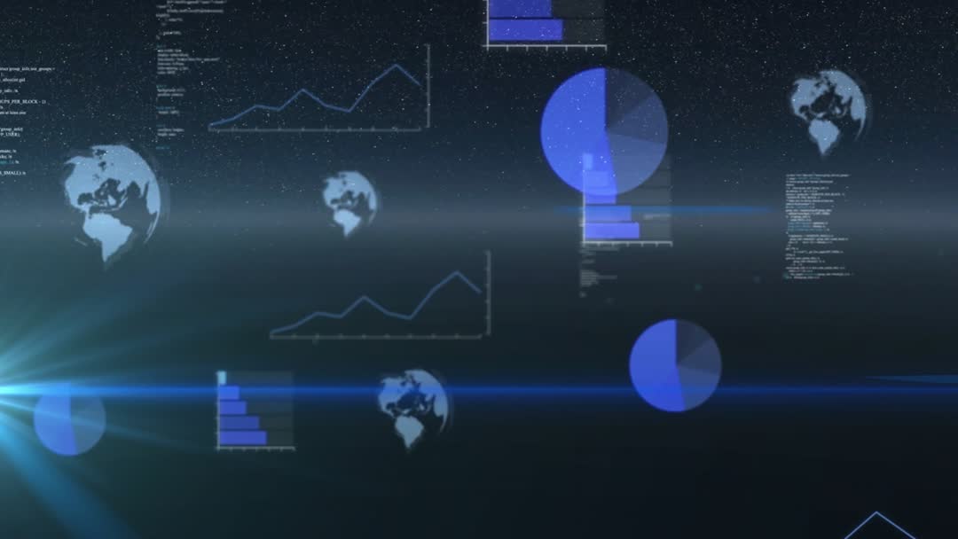 Animation showcasing animated data elements like graphs, diagrams, and global symbols revealing on a digital interface that seem to hover in a cosmic background with a blue flare effect. Useful for portraying futuristic digital transformations, technological advancements in data visualization, big data concepts, technology look of modern interface design projects, corporate presentations on data analysis achievements.