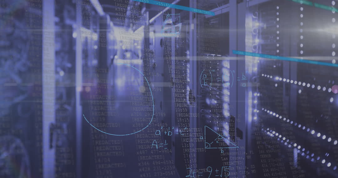 The visual seamlessly mixes mathematical equations with a high-tech server room, showcasing an application in fields such as big data and advanced computing workshops. Perfect for illustrating concepts in technology-driven innovations, educational materials related to data science, or promotional work for tech firms and digital consultancy services.