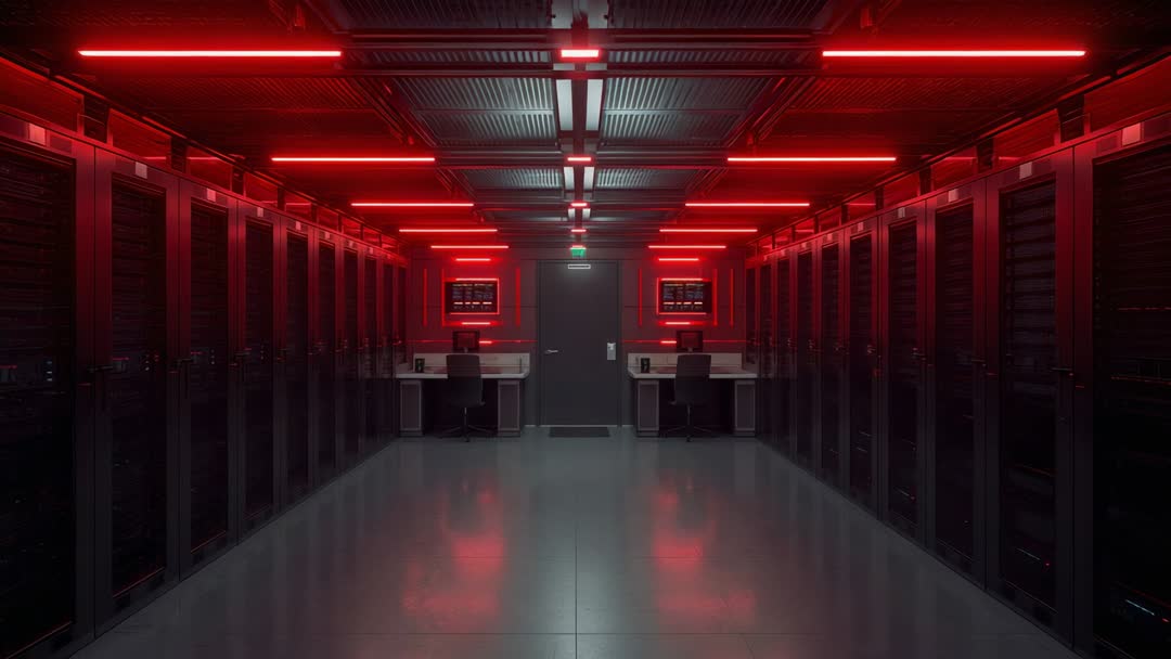 AI Generated Image. Video showing long data center aisle lined with tall server racks on both sides, red LED strips running along ceiling and walls creating dramatic cyberpunk atmosphere. Glossy floor reflecting red light and rack faces, increasing sense of depth and symmetry. Dual workstations at far end featuring monitors displaying system dashboards and status panels, central door providing visual anchor. Lighting and composition providing cinematic backdrop for technology narratives including cloud computing, cybersecurity, data storage, and AI research. Use cases: website hero banners, corporate presentation openers, advertising for colocation or hosting services, intro sequences for webinars, background plates for motion graphics and editorial coverage. Production tips: using slow push-in or lateral pan for cinematic movement, looping footage for ambient background, adding animated data visualizations or UI overlays for product demos, adjusting color grading to shift mood from intense red to cool blue.