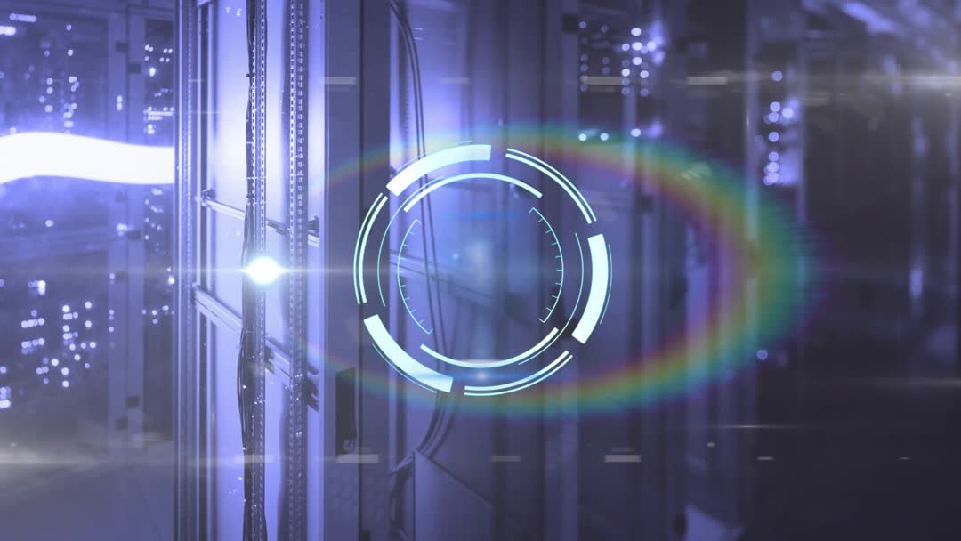 Featuring pulsing cyan HUD ring rotating over dim server rack corridor, star flare aligning with center and creating futuristic scanning vibe. Providing neon lens flare, rainbow ghosting and subtle bokeh highlights for cinematic tech atmosphere. Serving as dynamic video clip for technology presentations, cybersecurity intros, cloud computing promos, product demo openers and UI concept reels. Enhancing corporate IT branding, startup pitch decks, broadcast bumpers, website hero sections and conference openers. Allowing easy compositing as foreground HUD layer, placing logo or data readouts inside circular HUD for branding or visual storytelling. Suggesting use of lower-third text, color grading to match brand palette, and looping short segments for ambient background or title reveal. Supplying versatile asset for editors and motion designers seeking modern, high-tech visual language.
