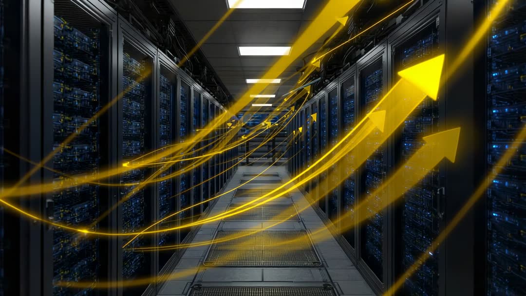 AI Generated Image. This visually striking scene captures the dynamic flow of data represented by bright arrow-shaped light trails streaming through rows of sleek data center server racks. This imagery symbolizes innovative technology and swift digital connectivity, as bright, golden lines signify ideas of data transfer and network flow. Perfect for illustrating articles or presentations about cutting-edge technology, digital infrastructure, and networking systems, showcasing advancements in data centers or breakthroughs in technological innovation.