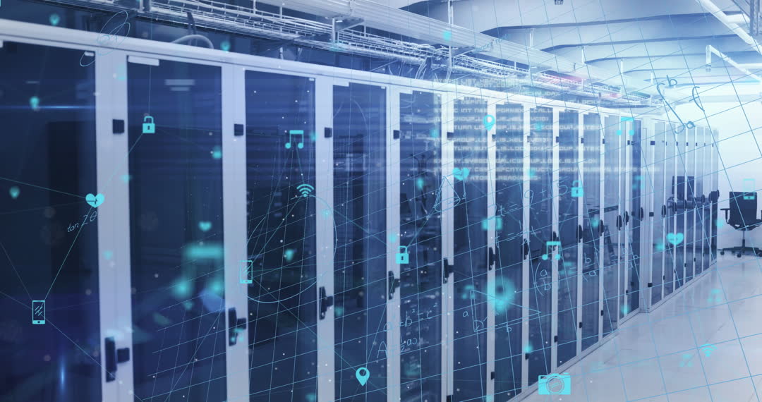 This depicts a modern data center with a layered digital overlay of mathematical equations and processing symbols. Conveying a theme of advanced global computing systems, network technology, and data management, it is ideal for use in articles or advertisements related to information technology, data processing, cybersecurity, and cloud services.