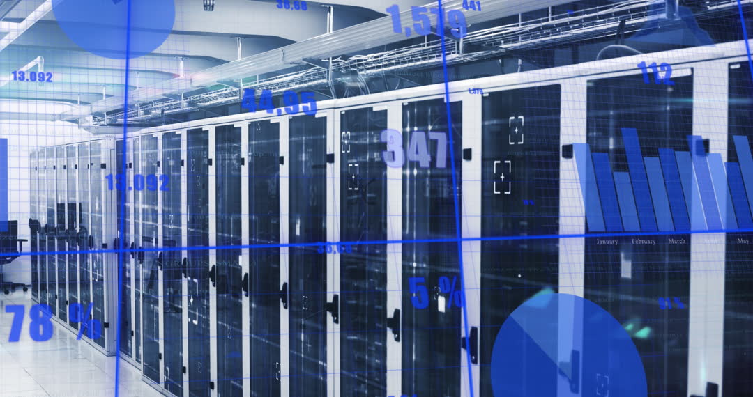 Visual of a modern data center incorporating financial and technological data overlays, revealing the intersection of data processing and financial technology. Useful for illustrating themes of digital economy, cloud computing services, cybersecurity infrastructure, and technological advancements. Ideal for articles, presentations, or advertisements focused on digital transformation and modern IT solutions.