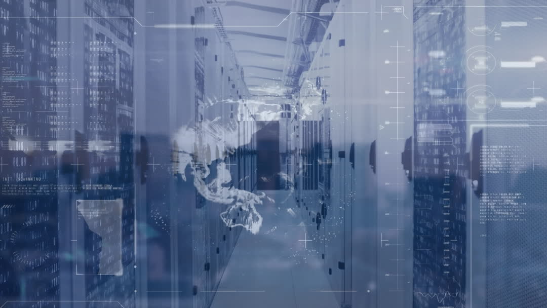 This video shows a modern data center corridor combined with digital graphics of a globe and interface elements. It symbolizes global connectivity and advanced financial technology. Apt for illustrating topics in IT infrastructure, cybersecurity, global networking, and digital business solutions.