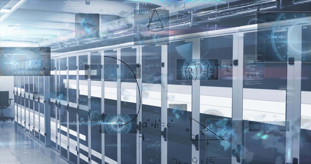 Modern server room overlaid with digital interface symbols and mathematical formulas. Represents concepts of advanced technology, data management, and digital innovation. Ideal for illustrating themes of tech evolution, data analytics, and global communication frameworks.