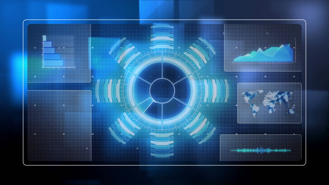 Visualization features futuristic digital dashboard elements including holographic globe, progress charts, and technological interfaces glowing in blue tones. Perfect for illustrating advanced computing systems, tech innovation, or digital marketing presentations. Suitable for backgrounds in technology-related videos, sci-fi scenes, and corporate data analytics.