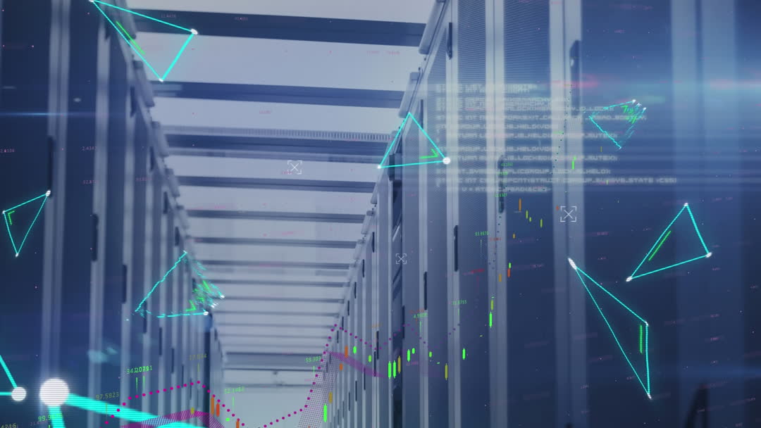 This video showcases a modern computer server room with abstract triangular shapes and digital data overlays, emphasizing a technological theme. The combination of realistic servers with digital enhancements suggests innovation and advanced data processing. Ideal for illustrating concepts in business technology, digital infrastructure, and data storage solutions.