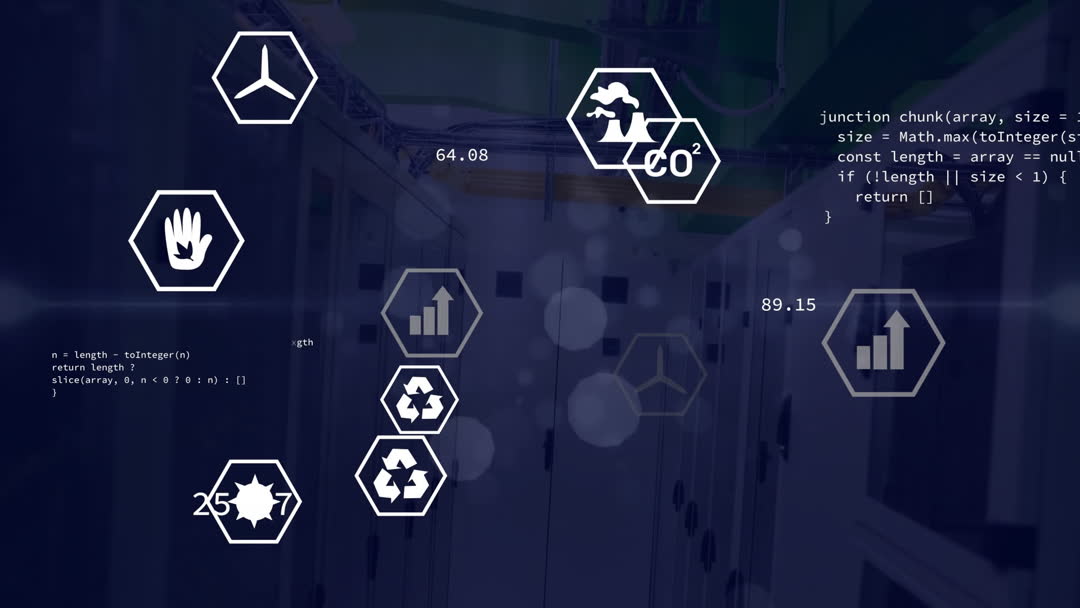 Icons displaying various data metrics hover over a background of servers, forming a digital interface suggestive of cutting-edge technological processes. Ideal for illustrating themes such as advanced computing, data analytics, industry technology advancements, and remote systems management in presentations, articles, and digital content.