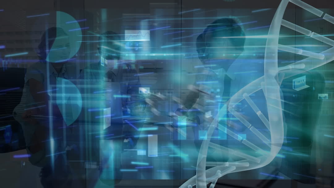 Visual illustrating fusion of digital technology and business. Features animated digital interface with data processing elements and three business professionals in modern office space. DNA strand suggests high-tech or biotech company setting. Useful for representing innovation, high-tech advancements in the workplace or the blend of science and commerce.