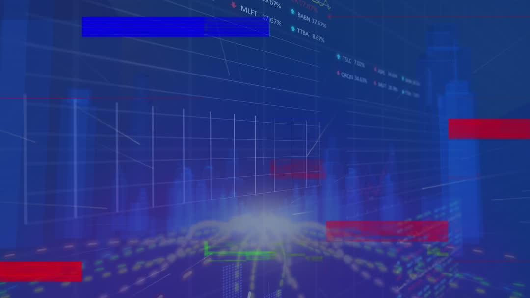 Shows animated data processing graphics layered over a cityscape, giving a high-tech and futuristic feel. Perfect for use in presentations, articles, or marketing materials focused on technology, data analytics, finance, or global business trends. Ideal for conveying themes of innovation and modern digital processes.