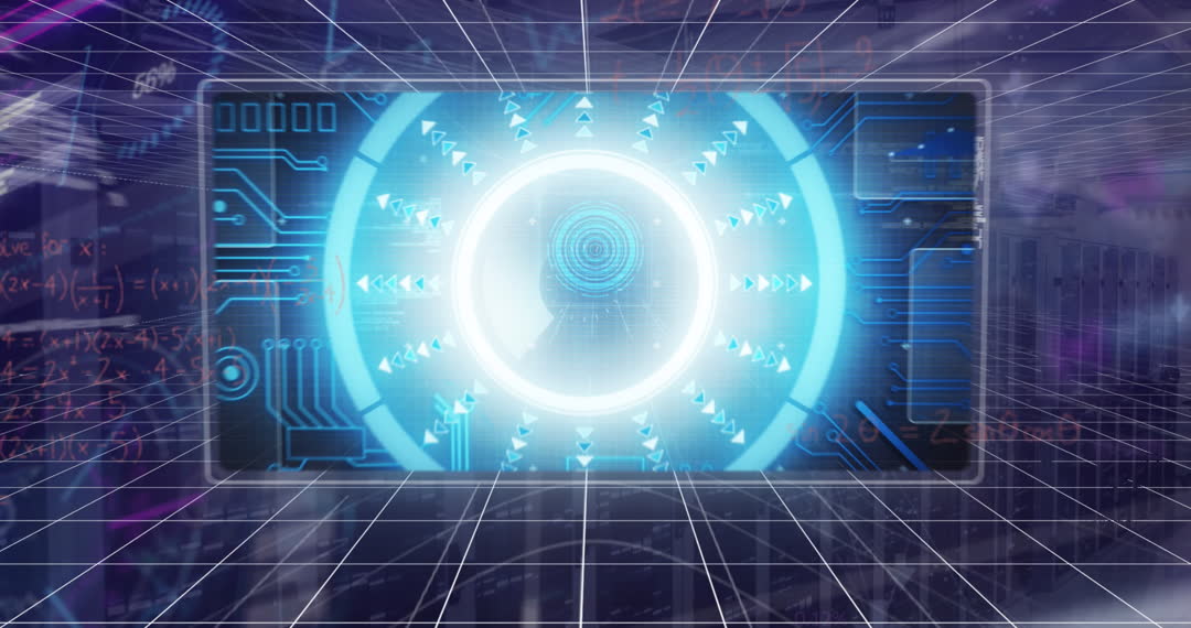 Futuristic view of a rotating digital interface screen surrounded by a high-tech server room backdrop. Useful for illustrating concepts in data processing, cybersecurity, and technological innovation. Ideal for articles on digital transformation, cutting-edge technology, or software related to data centers.