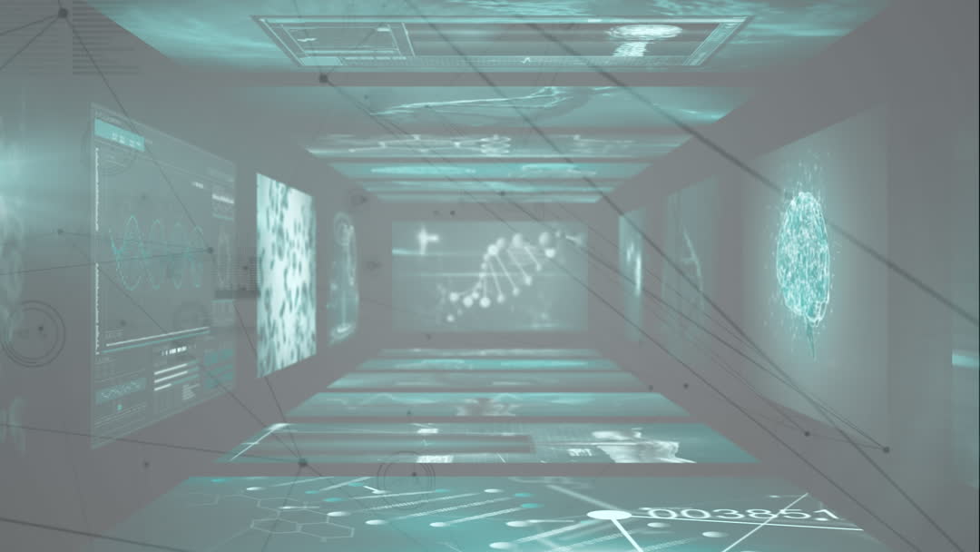 Image showcasing futuristic digital interface emphasizing global science and tech networks. Includes visuals of DNA strands and complex data. Ideal for tech magazines, blogs on digital innovation, presentations about scientific advancements or discussions on data processing and AI evolution.