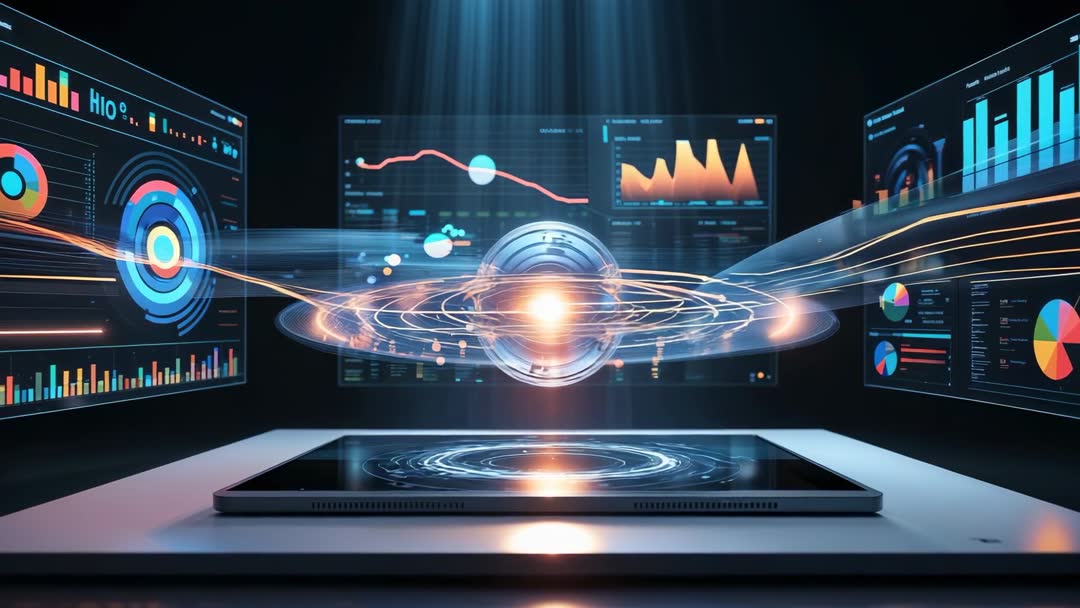 AI Generated Image. A captivating scene of a futuristic technology room where a tablet projects a floating orb and electric rings into the air while surrounded by three data-filled monitors. This dynamic setting showcases advanced data visualization and digital analytics concepts, suitable for use in technology presentations, artificial intelligence exhibitions, or sci-fi themed showcases.