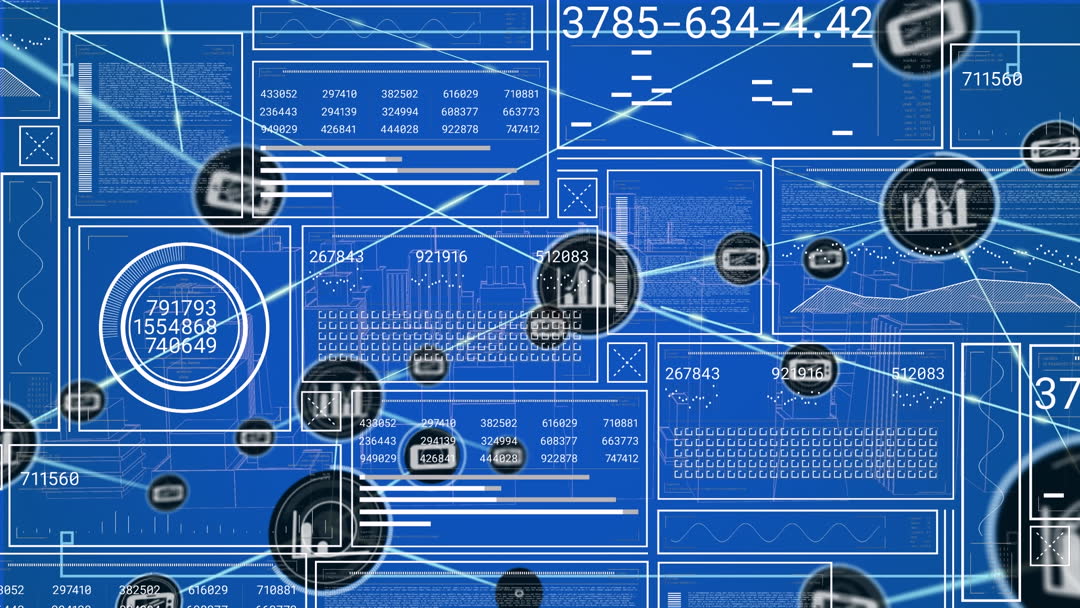 This features a dynamic animation of interconnected data symbols across a blue digital interface, suggestive of networking and technological communication. It is suitable for use in presentations, educational materials or advertising related to tech innovation, global communications, or data analysis.