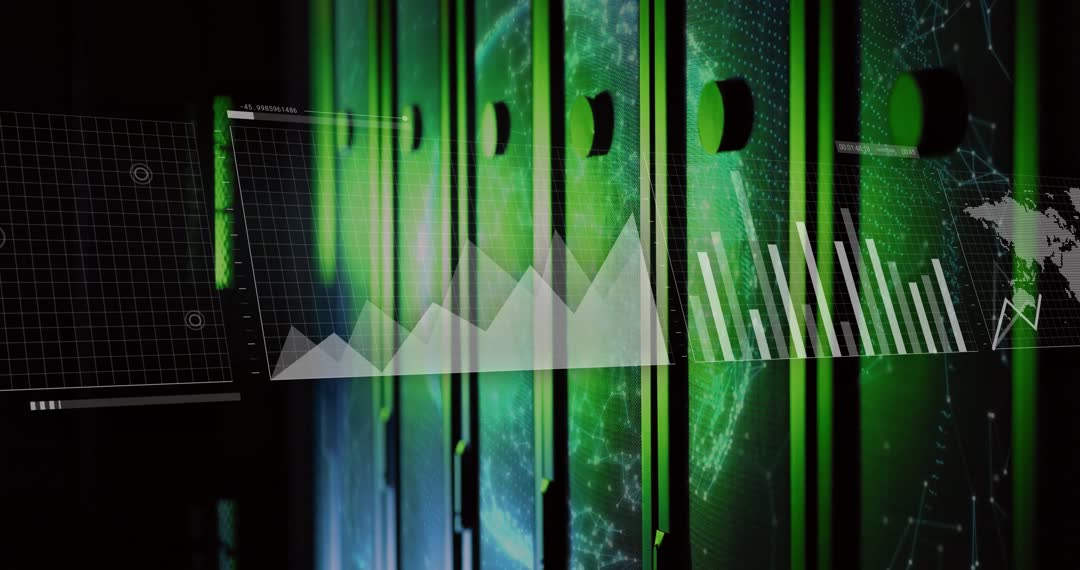 Dynamic visualization of network data represented by overlay of graphs on futuristic servers. Ideal for showcasing cutting-edge technology, cybersecurity solutions, and digital transformations in enterprise environments.