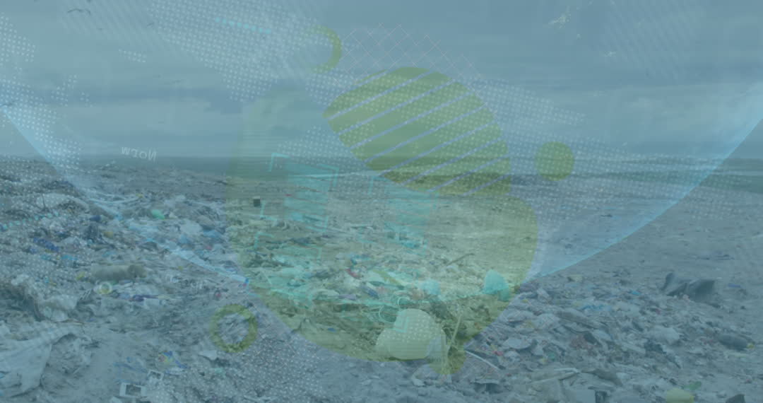 The visual presents a digital overlay of patterns and shapes over an oceanic or beach landscape strewn with waste, depicting data analysis or processing related to environmental issues. The videory conveys the intersection of technology with ecological themes, useful for illustrating environmental data analysis, technology applications in waste management, or sustainable tourism and coastal protection initiatives.