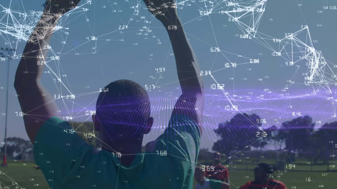Football players on training field with layered data networks representing data analysis and connections in sports. Suitable for sports technology content, digital innovation marketing, and athletic performance research illustrations.