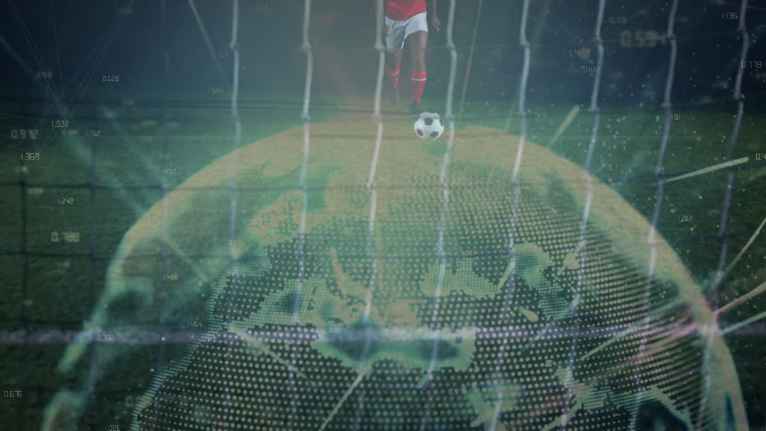 Digital overlay depicting planetary network videory interacts with scene of young soccer player preparing to kick ball, merging sports with technology theme for promotional use in sports tech development, digital networking in athletics, Sports data analysis concepts such illustration essential for marketing high-tech advancements in global sports industry appeal.